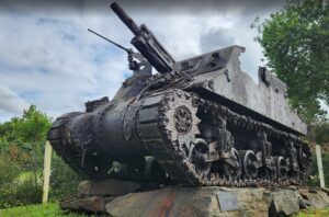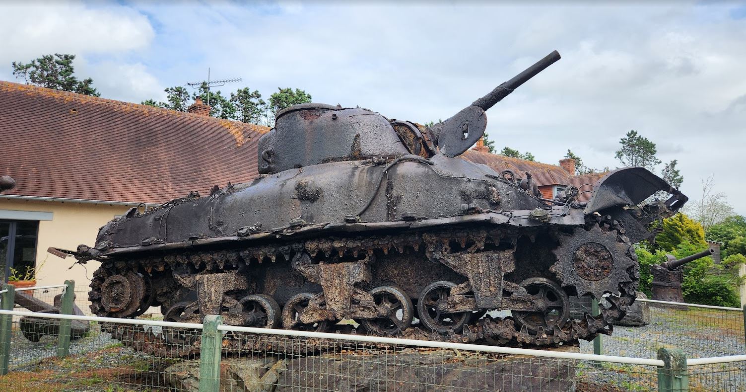 The museum, in its outdoor displays, features a DD Sherman tank sunk four miles from Omaha Beach in 88 feet of water. On June 6, at 6:30 am, 32 amphibious DD tanks from the 741st Tank Battalion were launched, but 27 sank in the heavy seas. Only two reach the beach.